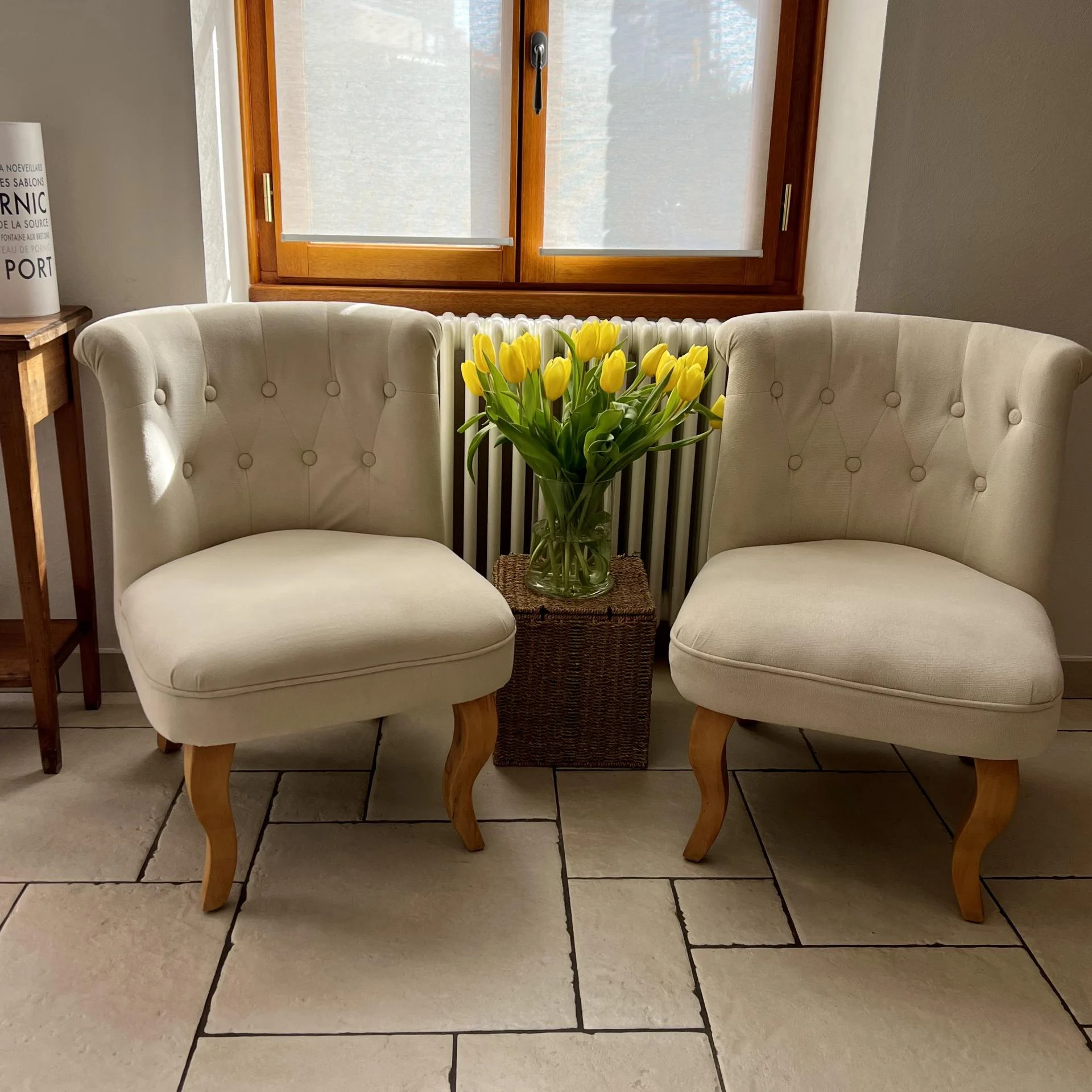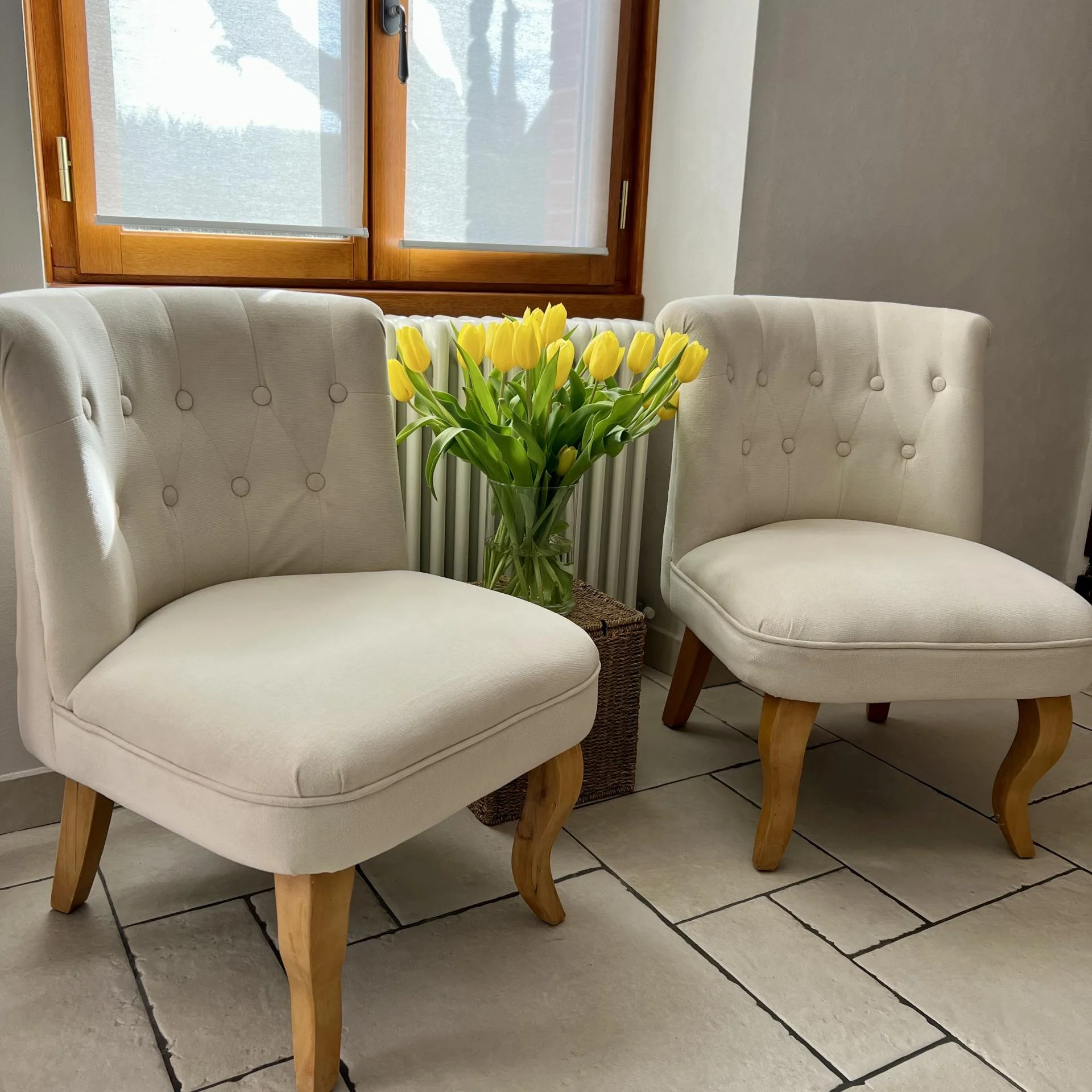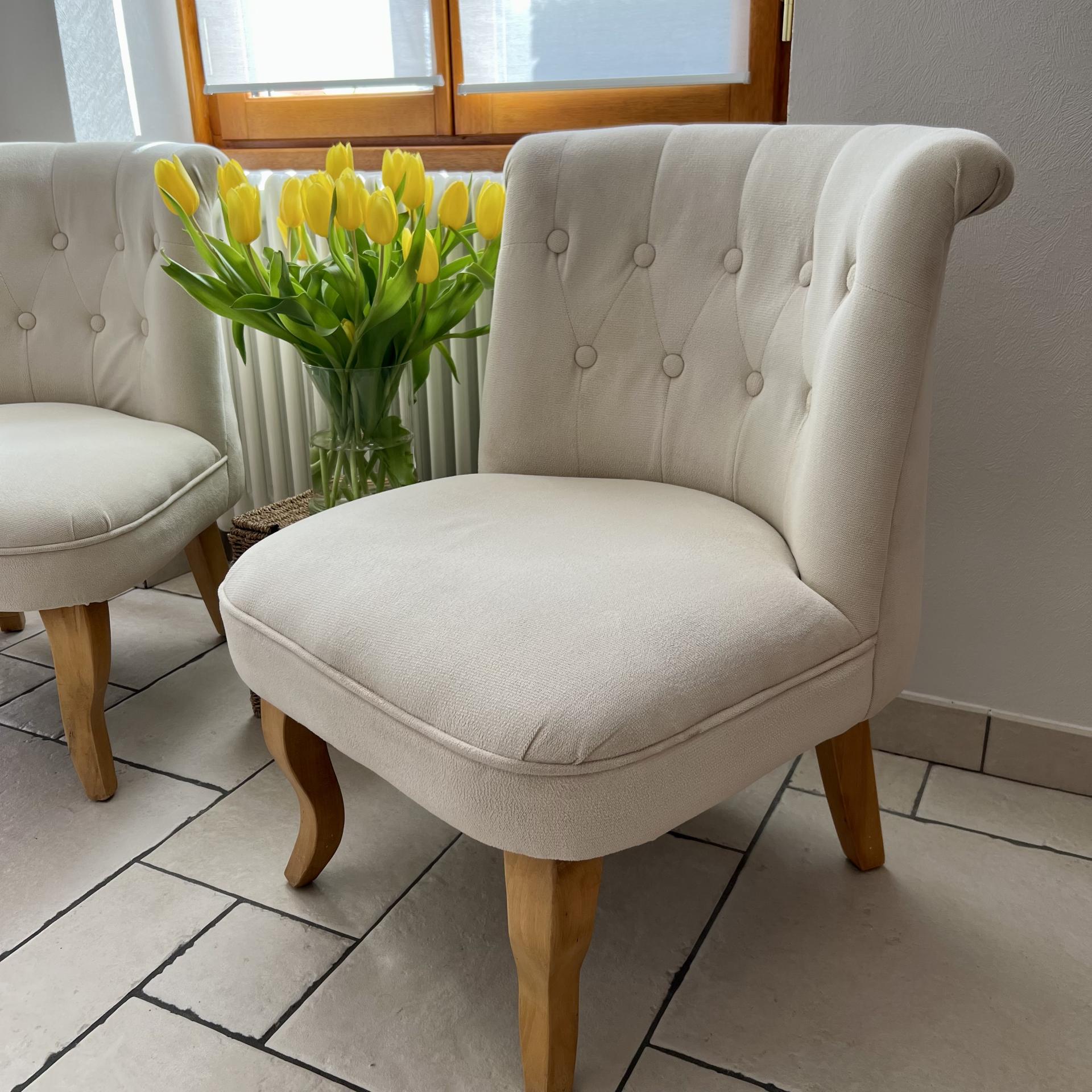 Deux petits fauteuils chinés dans le Pays de Retz. Bien mal en point, ils ont été soumis à un bon nettoyage et différentes coutures permettant la remise en état de l'assise. Les pieds ont été soigneusement poncés et traités.